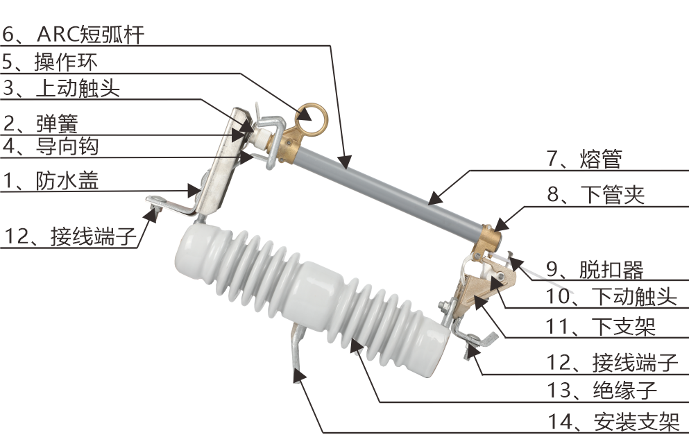 從整體架構(gòu)來看,跌落式熔斷器主要由絕緣支座、動(dòng)靜觸頭、熔絲管三大部分構(gòu)成。